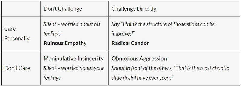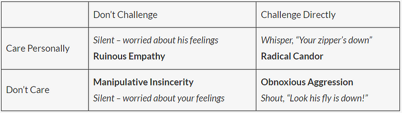 Clearly, Radical Candor is the gold standard. It promotes better work and personal growth while cementing trust and care. On the flip side, Manipulative Insincerity is the least desirable.